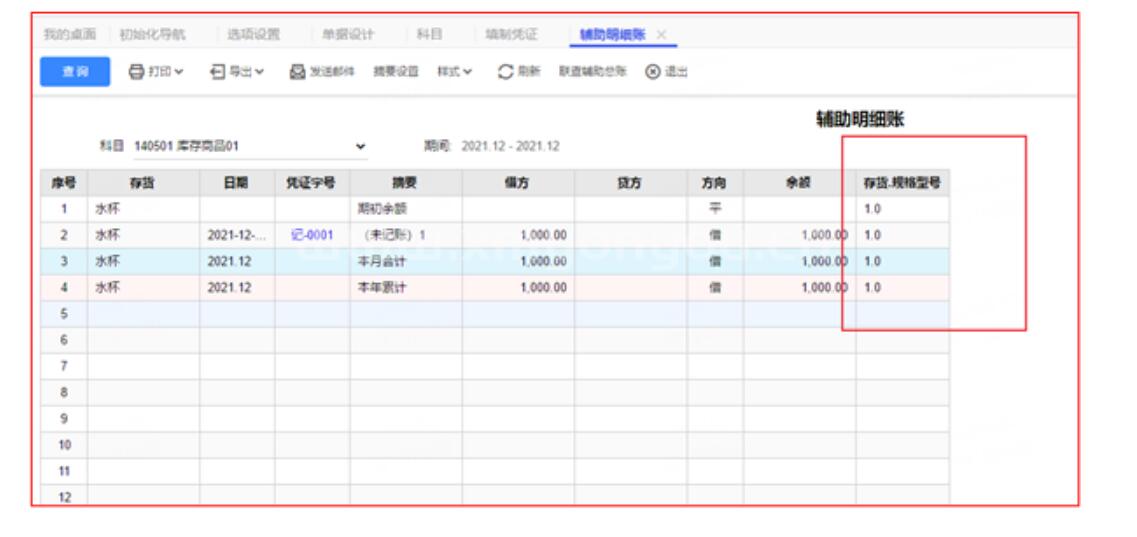 T+中会计科目挂了存货辅助核算,想要在科目辅助帐中能显示出存货的规格型号。