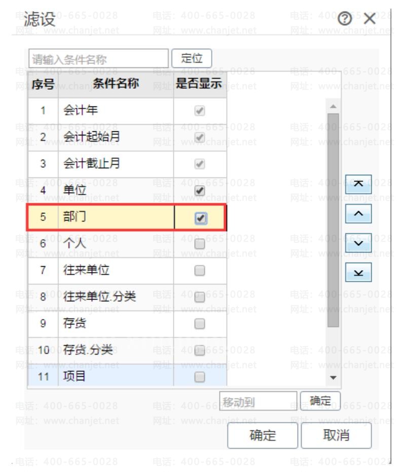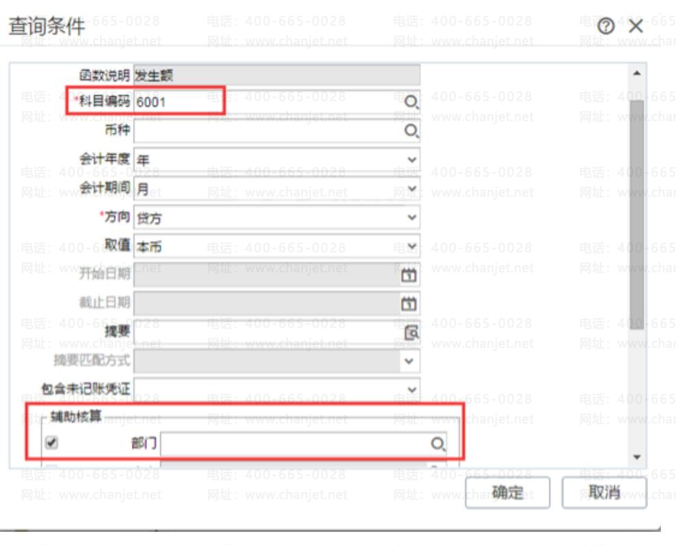 3、在【查询条件】中选择对应科目后勾选【部门】辅助项,不要选择具体部门信息;