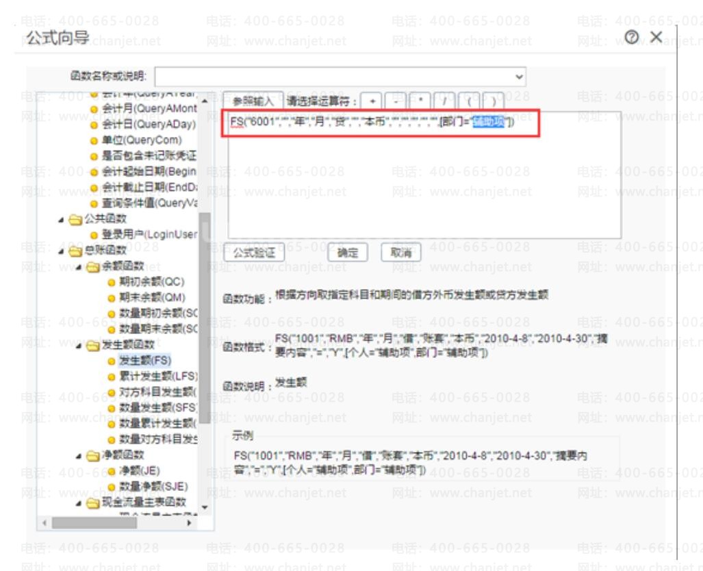 4、在设置好的公式中,加上“辅助项”3个字,改为FS("6001","","年","月","贷","","本币","","","","","",[部门="辅助项"]),点击【确定】,将利润表所有项目中的公式都参照此方法设置好;