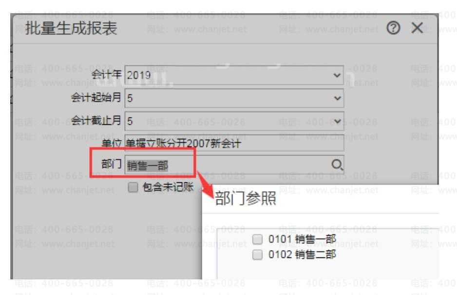 6、全部设置完成后,进入【报表数据】点击【生成报表】选择对应部门后点击【确定】即可生成按部门取数的利润表。