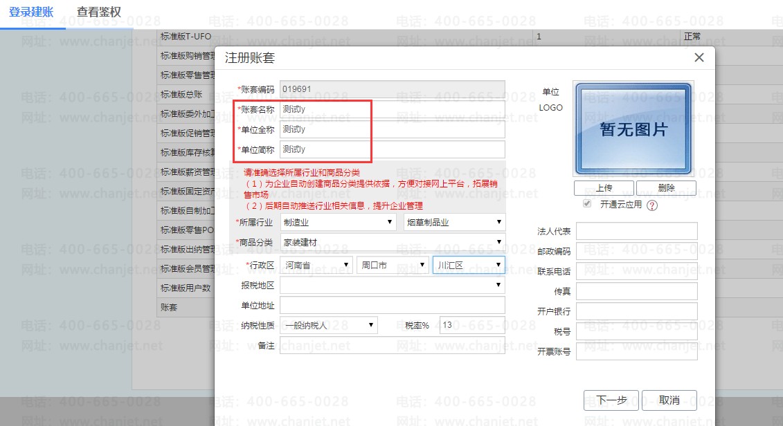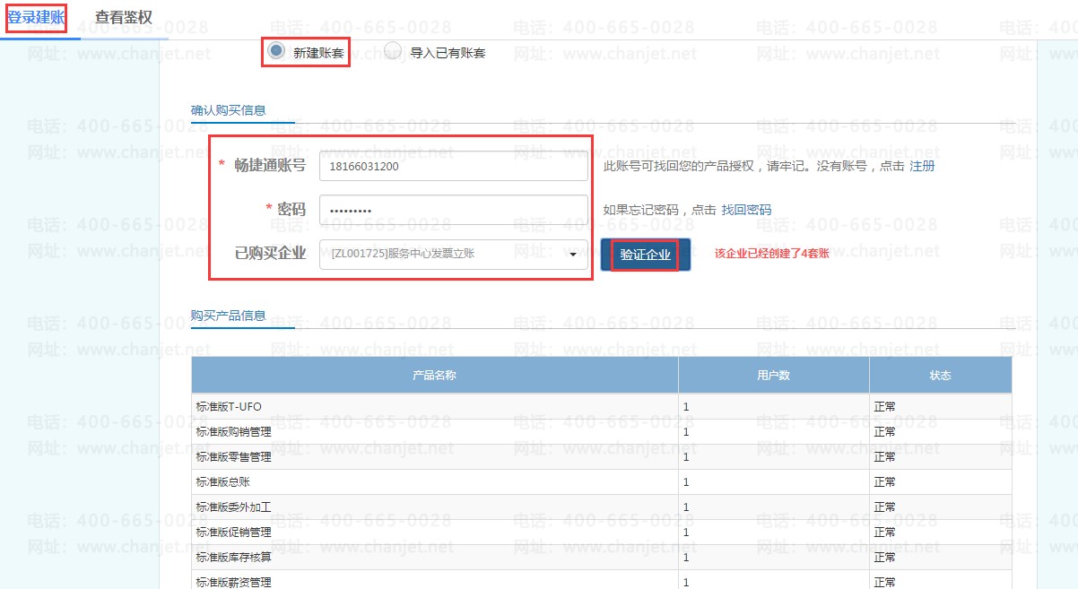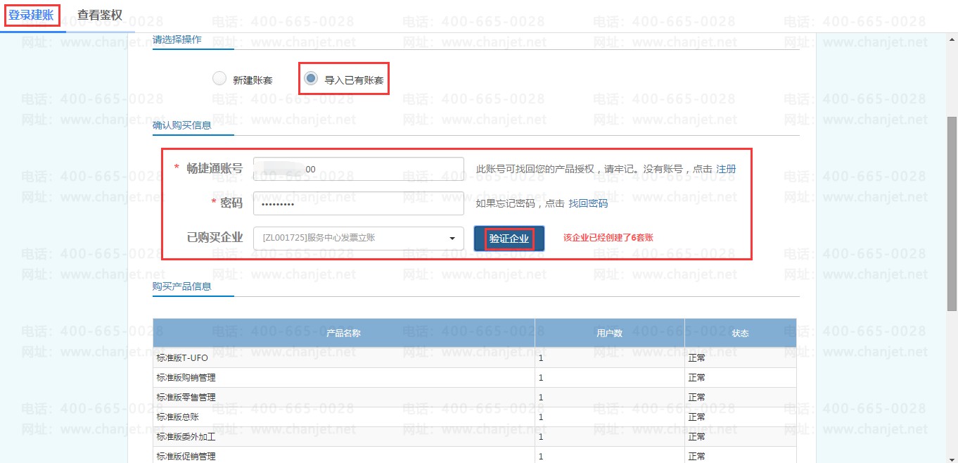 在CLOUD登陆界面,点击【正式使用】进到【登录建账】页签,输入畅捷通账号密码进行验证,选择【已购买企业】再点击【验证企业】会带出下面的购买产品信息,然后点击【下一步】进行创建账套;