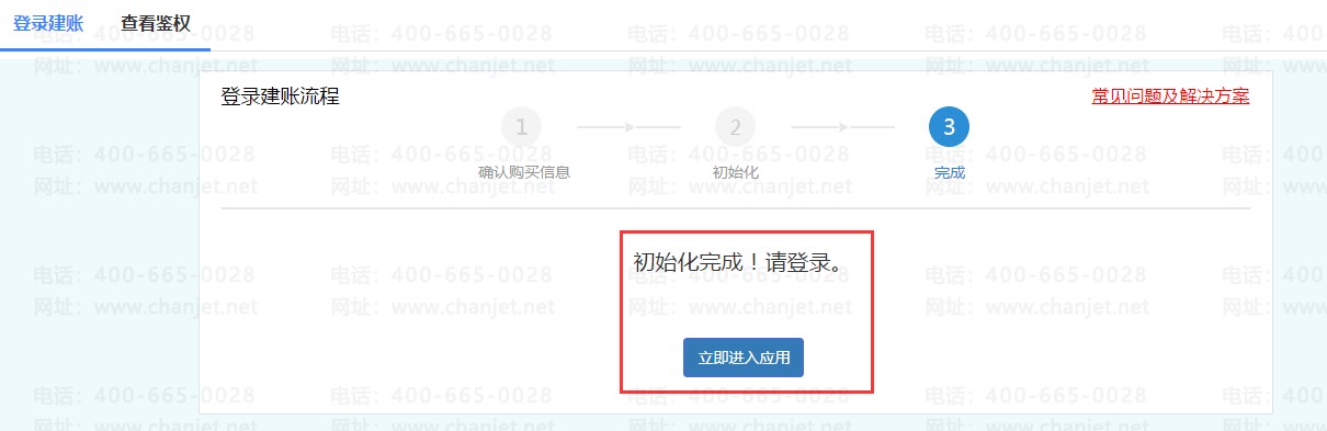 创建账套成功后会提示“是否进入新建账套”,点击【是】会进到下面这个初始化完成【立即进入应用】界面,即可到达登陆界面。