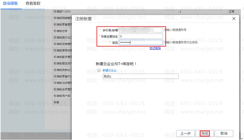 输入对应账套名称等相应信息后点击【完成】;