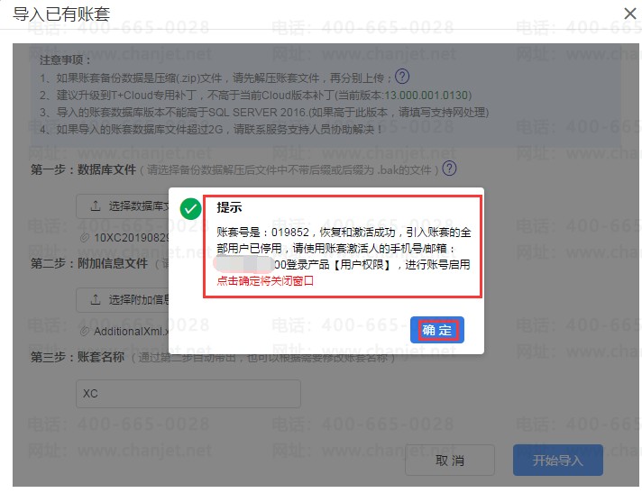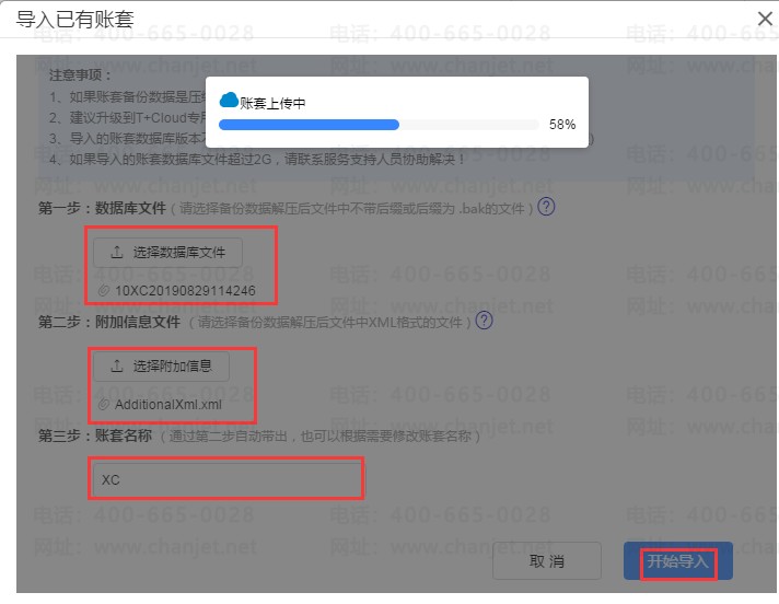 选择需要导入的账套数据库文件,格式为备份数据解压后文件名中不带后缀或后缀为.bak的文件,附加信息文件为账套备份数据中的.XML文件,输入账套名称后点击【开始导入】;