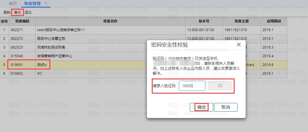 以【企业管理员】身份登陆,在【账套及用户管理】-【账套管理】里找到需要备份数据的账套,点击上方【备份】按扭,输入激活人员手机号收到的【验证码】-【确定】;