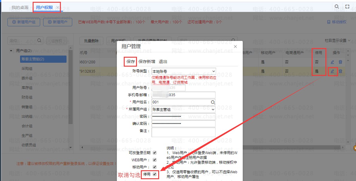 导入成功后,用账套激活人员的手机号进行登陆,在【系统管理】-【用户权限】找到账号【停用】显示为【是】的账号,点击后面笔状按扭进行修改,把【停用】勾选项取消勾选即可启用之前账套账号;