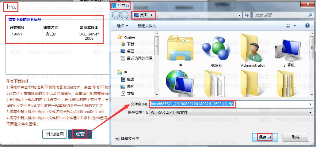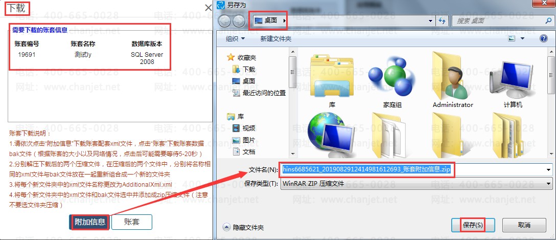 在弹出的【下载】对话框可以看到对应需要下载的账套信息,点击【账套】/【附加信息】选择备份数据存放的路径,文件名称点击【保存】即可保存到指定路径下。