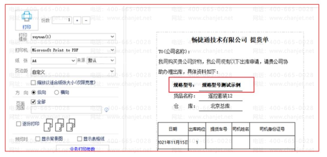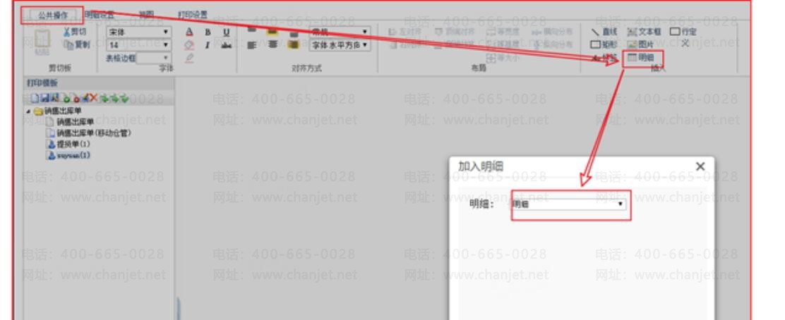 需要在打印模版上增加某项明细字段数据,但是不想以表格形式体现,如下图所示: