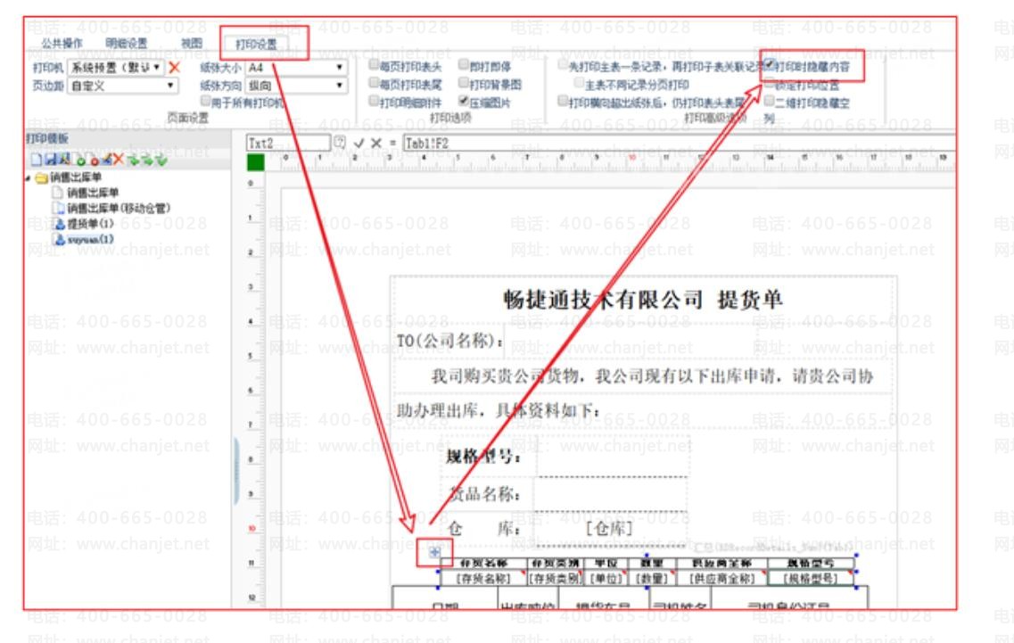 5、直接打印出来不太好看,需要把明细表格隐藏,,选中表格后点击打印设置,勾选打印时隐藏内容就可以了。