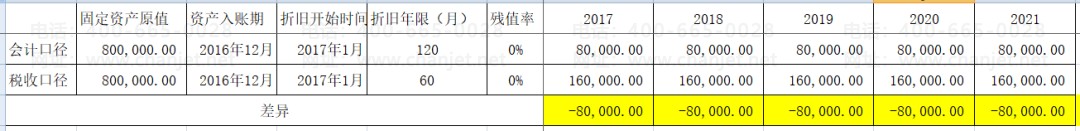 A公司2016年12月购进一台价值80万的机器设备,不考虑残值,会计按10进行折旧,税法上机器设备最低折旧年限也是10年。