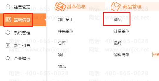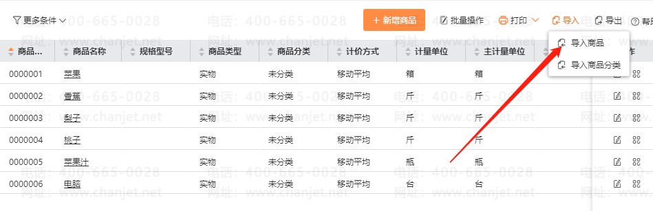 1.进入【基础信息】-【商品】,点击右上角的【导入】-【导入商品】(注意商品分类需要的话需要提前新增或者导入,也是点击导入下面选择商品分类导入),如下图: