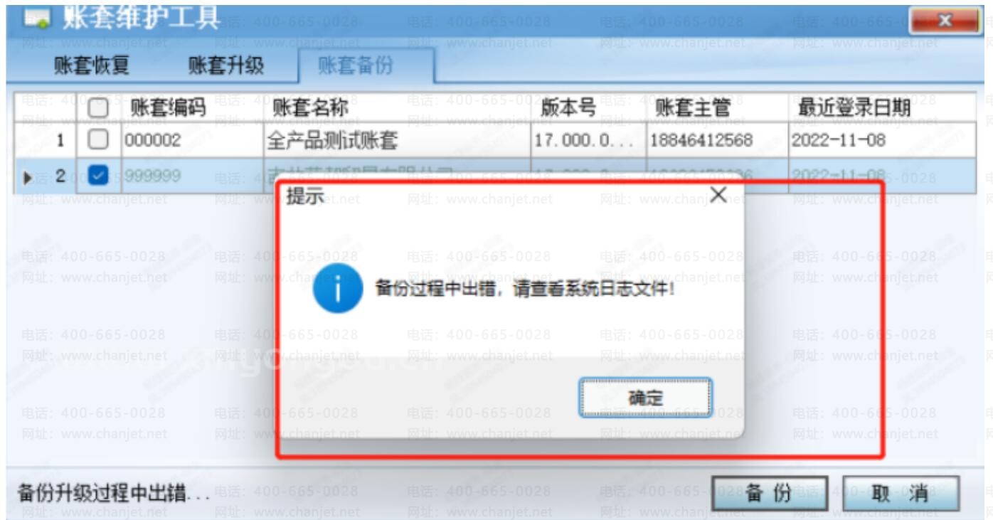 账套备份提示备份过程中出错,请查看系统日志文件