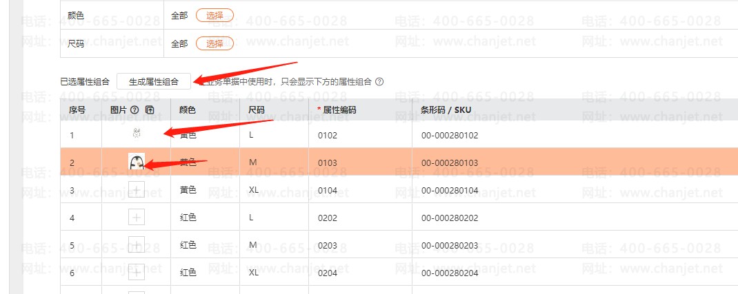 1、基础信息-商品中,编辑商品档案,生成对应的属性组合,然后在组合下添加各自的图片;