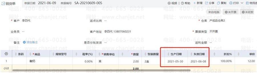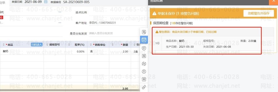 2、当商品已过保质期,出库时软件会提示【商品失效日期小于单据日期,已经过期】