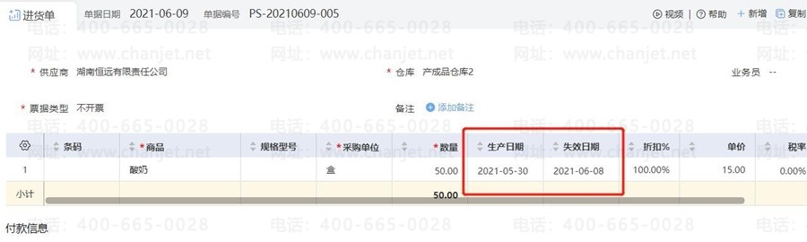 3、正常采购商品入库,单据上录入商品的生产日期,根据生产日期自动计算失效日期