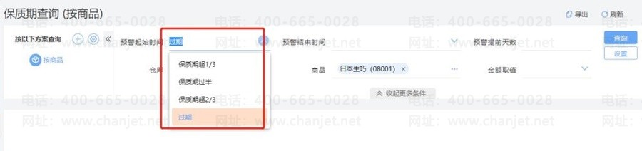 在【库存核算】-【保质期查询】表中,可以根据商品过保时间等进行查询
