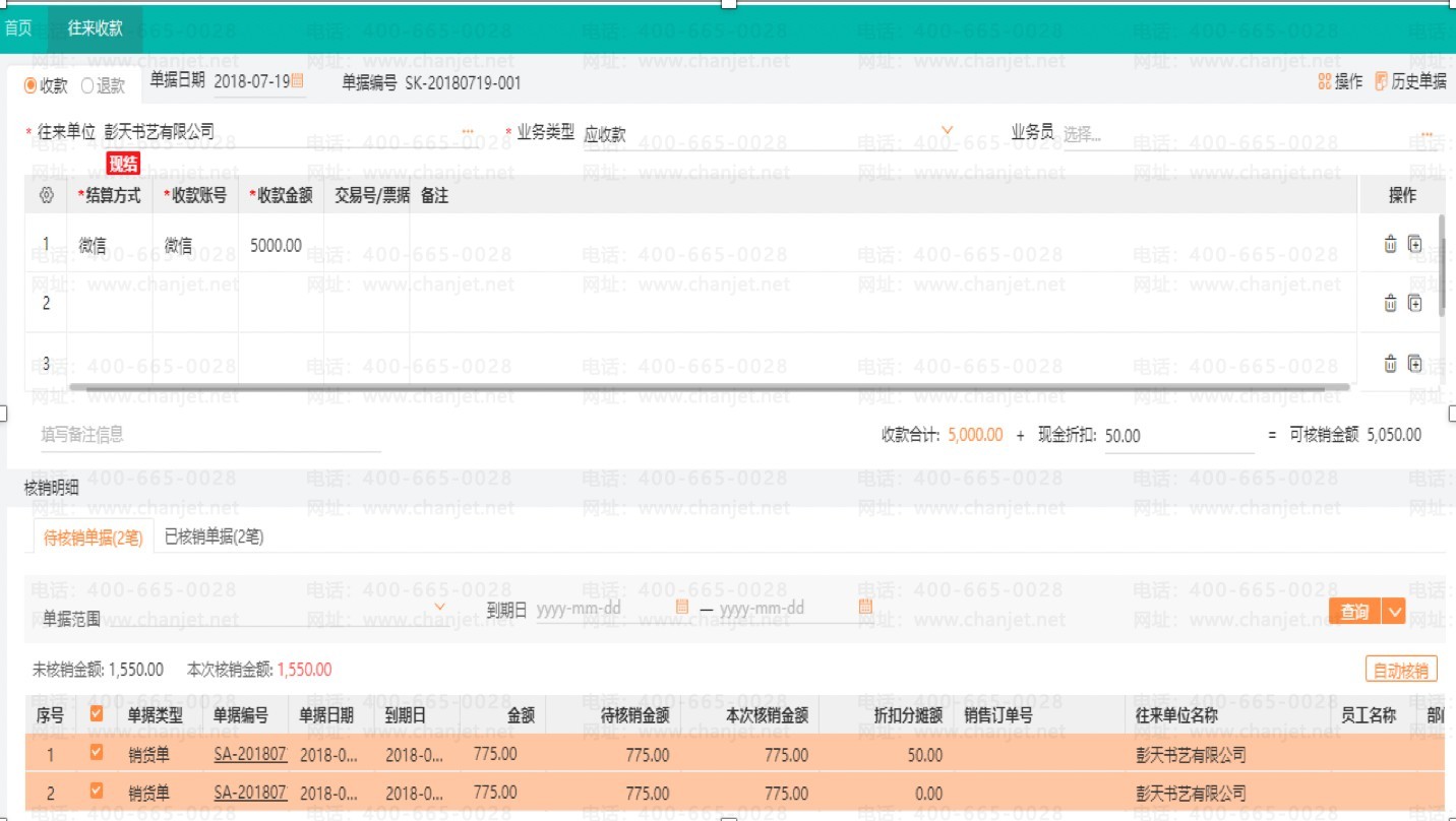 • 按明细核销:即在收款和付款时,将收款金额分别指定到销售的具体商品上。