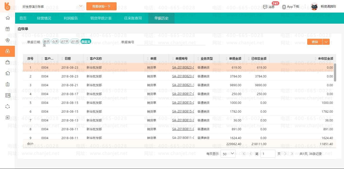 电脑端操作,资金-资金统计分析-往来账查询-查询-点击应收金额-查看应收款单据详情