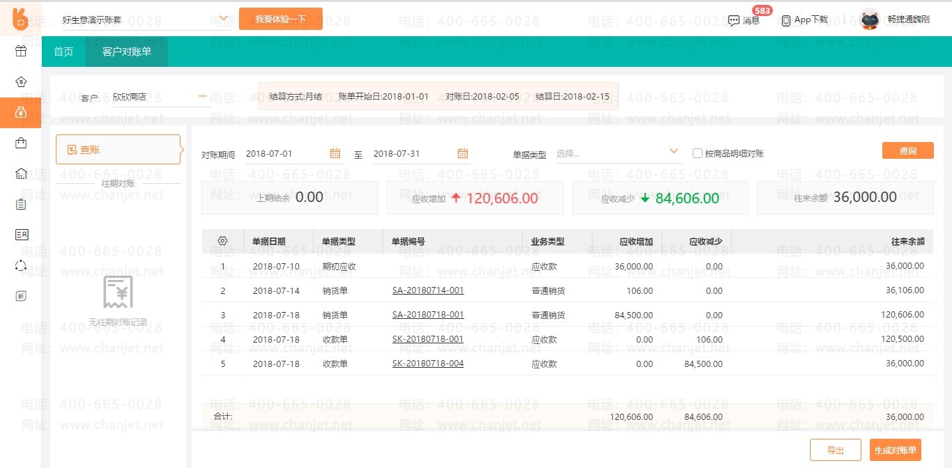 2. 生成对账单:查询无识后,可以点击生成对账单,系统会自动生成一个对账单, 对账单可以删除,可以再次生成。