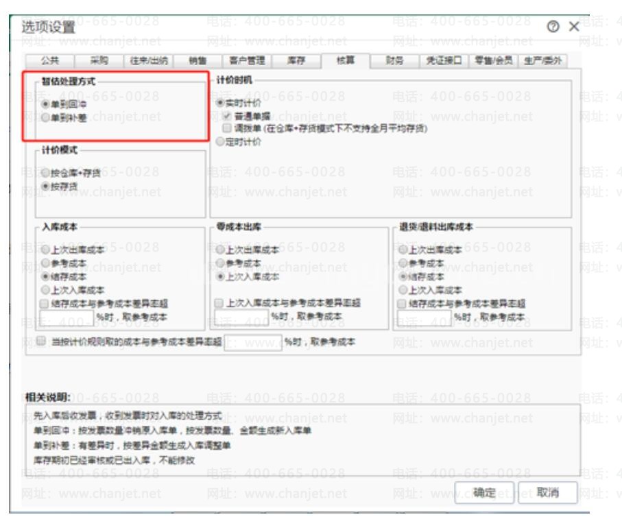 首先,点击【系统管理】—【选项设置】—【核算】中将【暂估处理方式】选择为【单到回冲】。