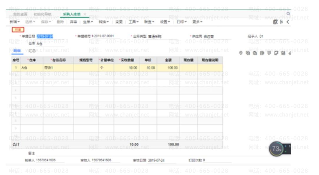 其次,在【库存核算】填制一张【采购入库单】。