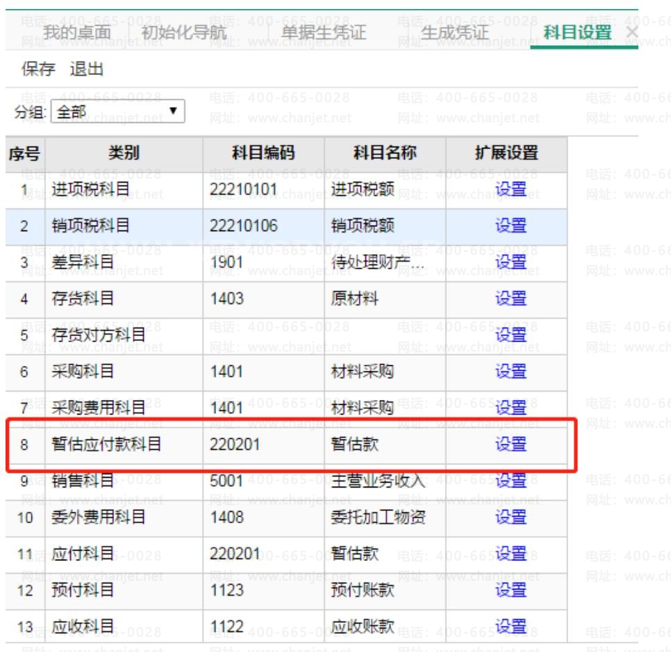 其次,在【总账】-【科目设置】中将应付暂估科目设置对应科目【应付账款-暂估款】