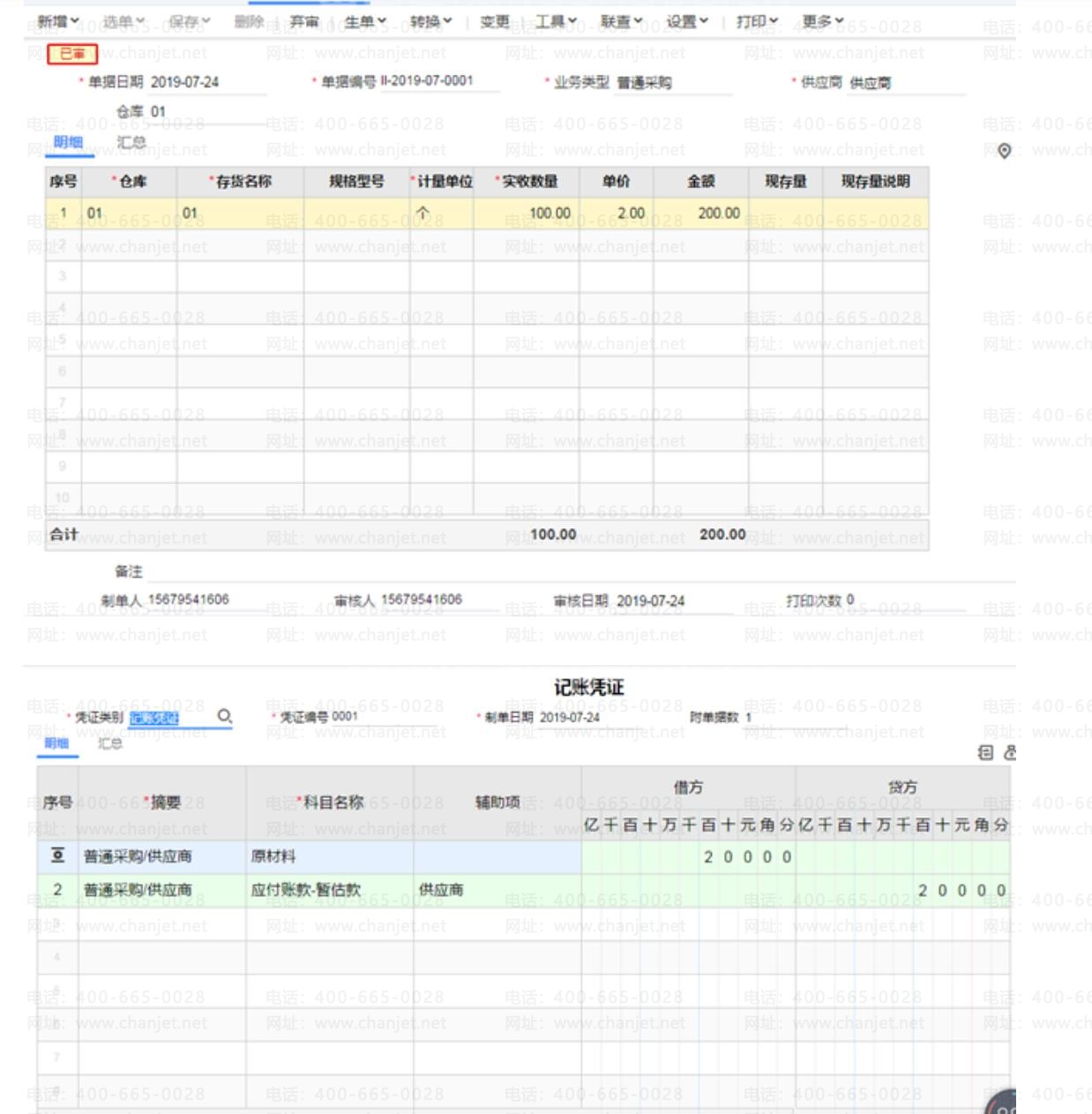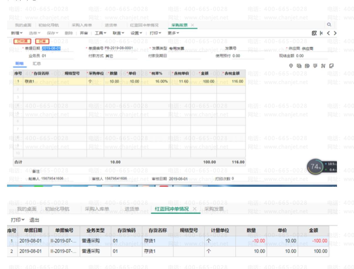 下月,采购发票来了,通过【采购入库单】生成【进货单】在生成【采购发票】,系统会自动生成相应的【红蓝回冲单】。