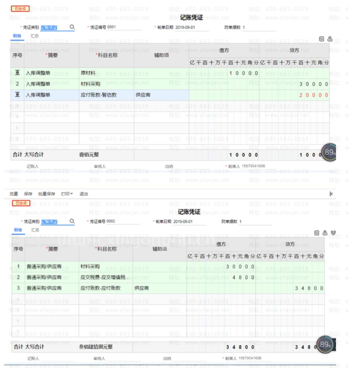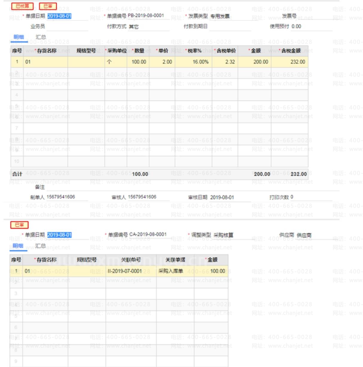 次月,【采购入库单】生成了【进货单】与【采购发票】,软件会形成相应的入库调整单。