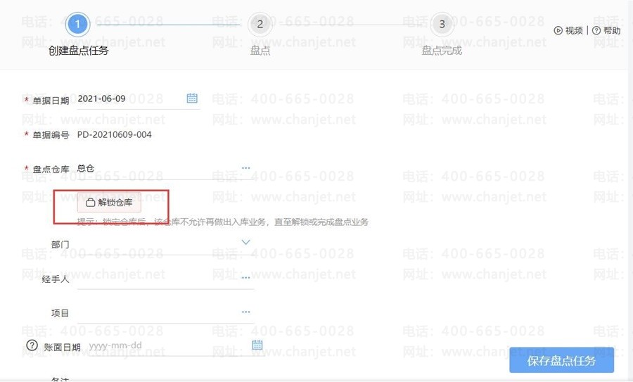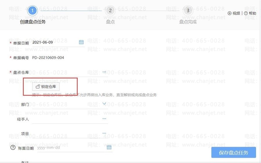 点击【好业财】-【库存核算】-【盘点单】,在创建盘点任务的时候,可选择锁定仓库
