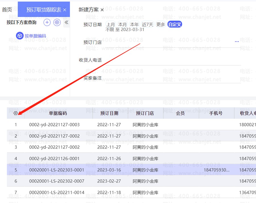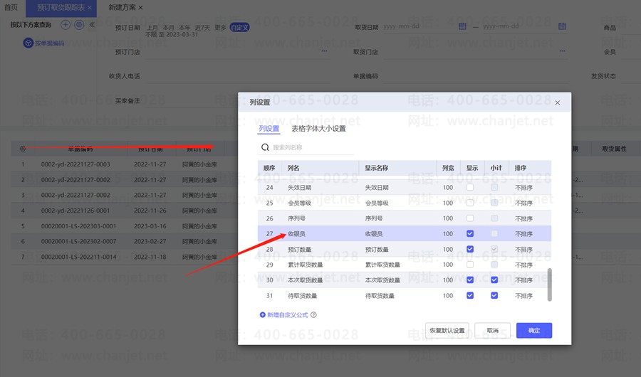 3.表体小齿轮可勾选其他字段显示,例如收银员。就可以查看到每笔预定单的收银员对应人。