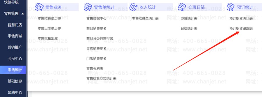 1.点击【零售统计】—【预订取货跟踪表】。
