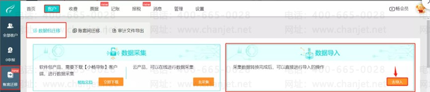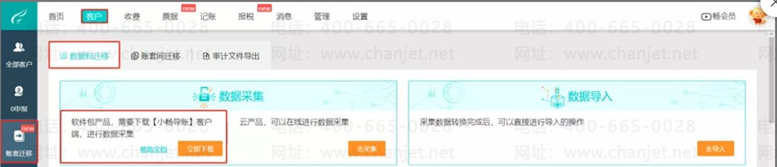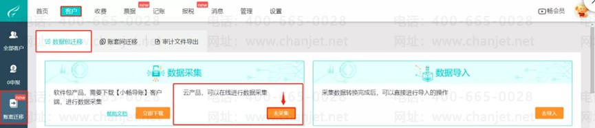 云产品可以在线进行数据采集,点击【客户】-【账套迁移】-【数据包迁移】-【去采集】,然后选择对应的产品,输入对应产品的账号密码,点击读取账套。