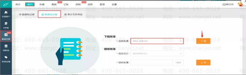 针对其他SAAS产品,点击【客户】-【账套迁移】-【账套间迁移】选择好需要备份的账套点击【下载】,如需上传备份文件可选择好指派会计然后选择备份文件点击上传。