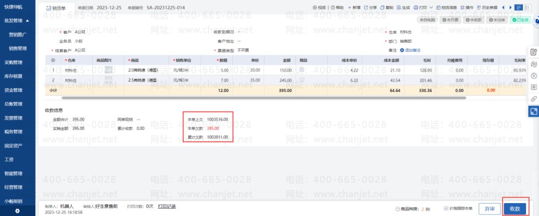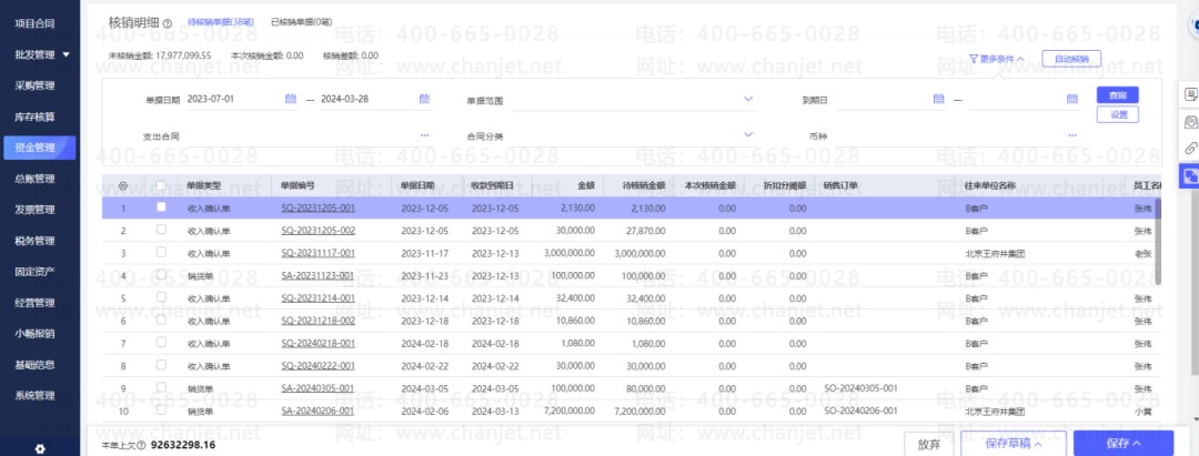 畅捷通好业财可以让你方便地进行收款核销,把它们从账本上划掉,比如预收冲应收,应收核销等。