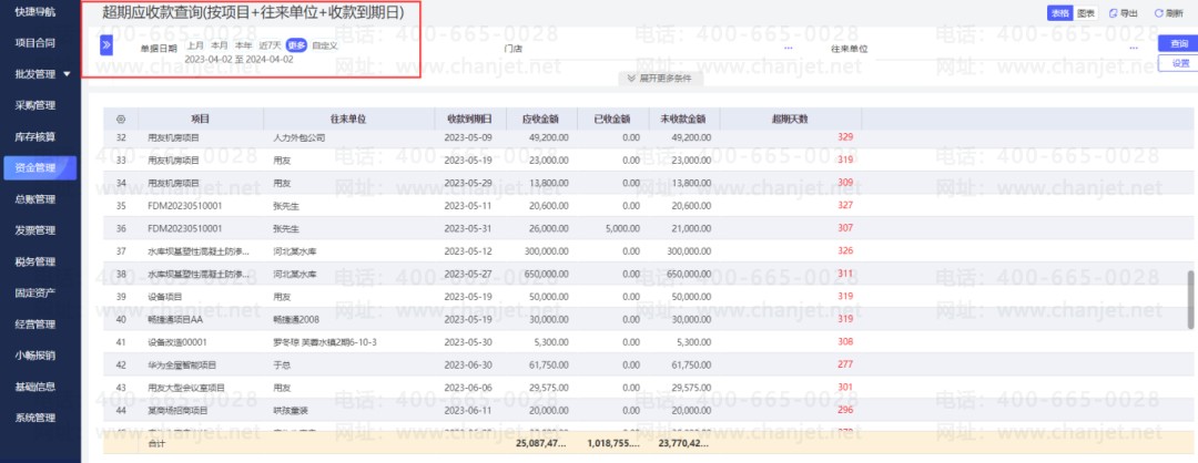 用友旗下畅捷通好业财ERP支持按项目、客户,自动根据收款到期日,生成超期应收款统计表,详细记录超期天数、应收款、已收款、未收款金额等。