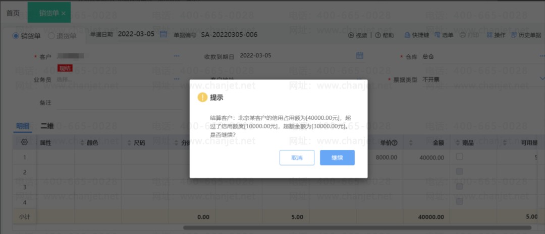 超出客户信用授权额度,系统自动提示