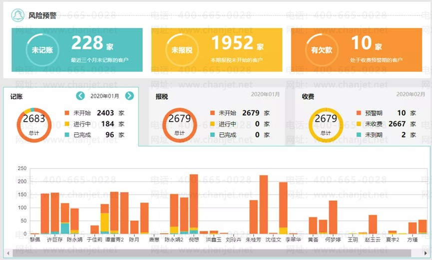 • 易代账:在界面设计上易代账更简洁,主要是针对代账公司多企业客户场景,可以清晰展示多企业账套详情、各细项(到票、记账、报税、缴费)进展及风险预警等信息,对于代账会计而言,能够快速查询和操作。交互体验很简单,即使是初次使用的用户也能够迅速上手。