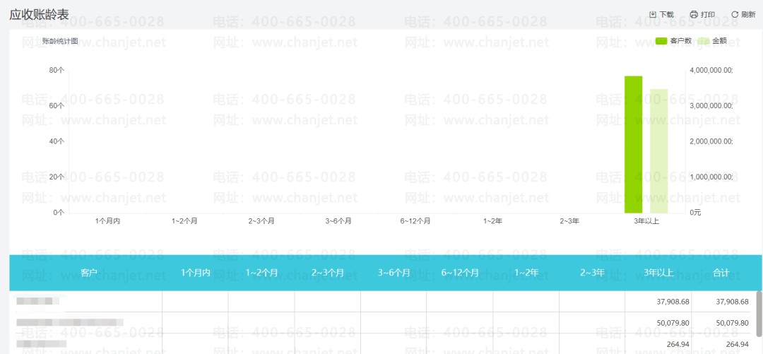 列表自动展示每个客户账龄情况,并通过可视化图表按月/按年统计各账龄区间客户分布,方便财务分析账款占用情况。