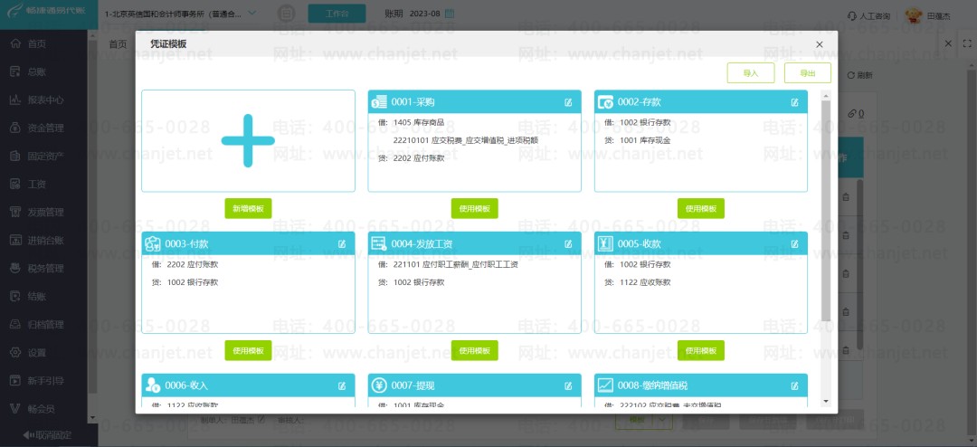 使用【模板】功能或快捷键“F4”,调用已有的存款凭证模板,易代账预制了8大常用模版,也可以根据实际公司业务按自己需要新增模版。