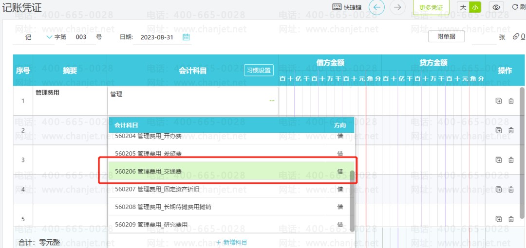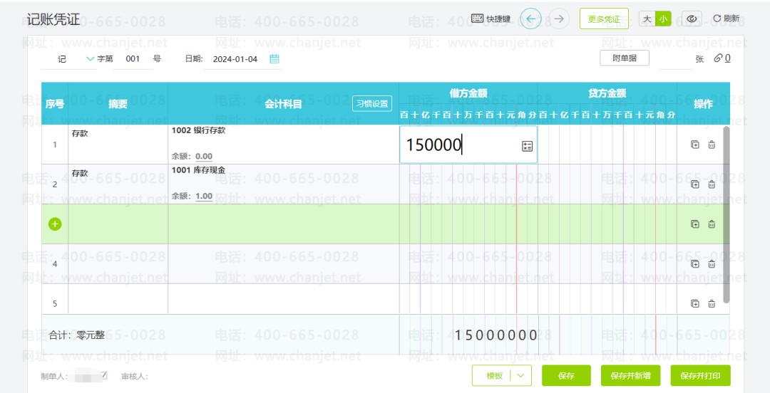 我们在填凭证时,通常需要录入的信息包括摘要、会计科目与金额,借贷方金额相等即可保存。