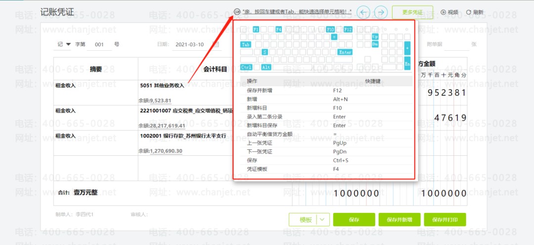 除了上面说的这几个,还有像多个凭证切换、新增凭证等更多录入凭证的快捷键如下: