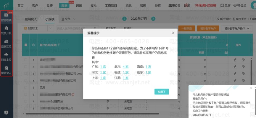 2、发票处理系统:高效管理多家公司的账务,用户无需频繁登录和插拔卡。通过一键取票,可以快速获取客户公司的所有发票信息(包括收到和开出的发票),并基于这些发票自动生成会计凭证。给客户开发票也可以平台内直接开具,不必再频繁切换税盘。