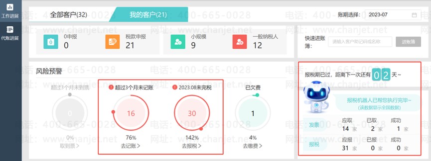 1、代账管理平台:易代账的代账管理平台可以实时观测代各个代账会计的工作进展,并让代账会计轻松管理客户的账务和报税状态。