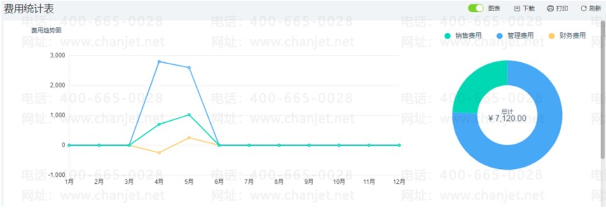 基于自动计算的明细费用数据,配套会生成趋势图,可以直观的查看各个月费用环比增长情况以及各项费用的构成占比,更便于企业查看分析长周期内的费用支出情况变化。