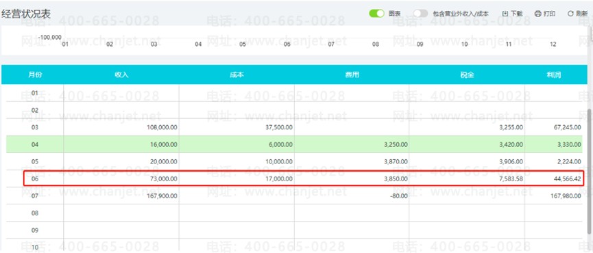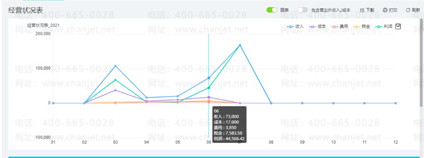 同样可以一键生成趋势报表,收入、成本、费用、税金、利润各自的数据情况一目了然。