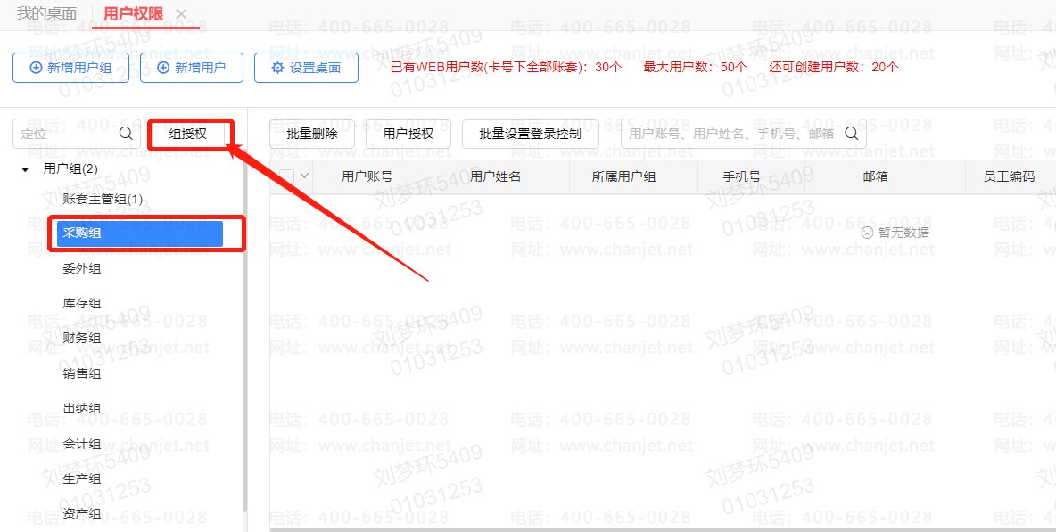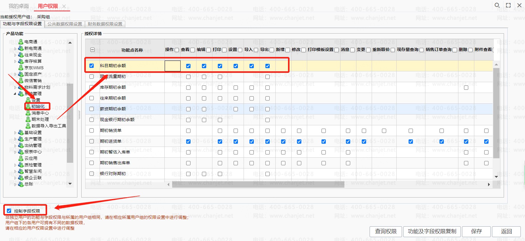 1.在【系统管理】-【用户权限】中,选中该用户所在的用户组,进行组授权,检查是否有修改科目期初余额的权限(如果是独立用户,则勾选该用户,点击用户授权)