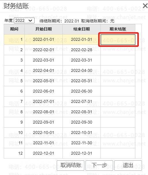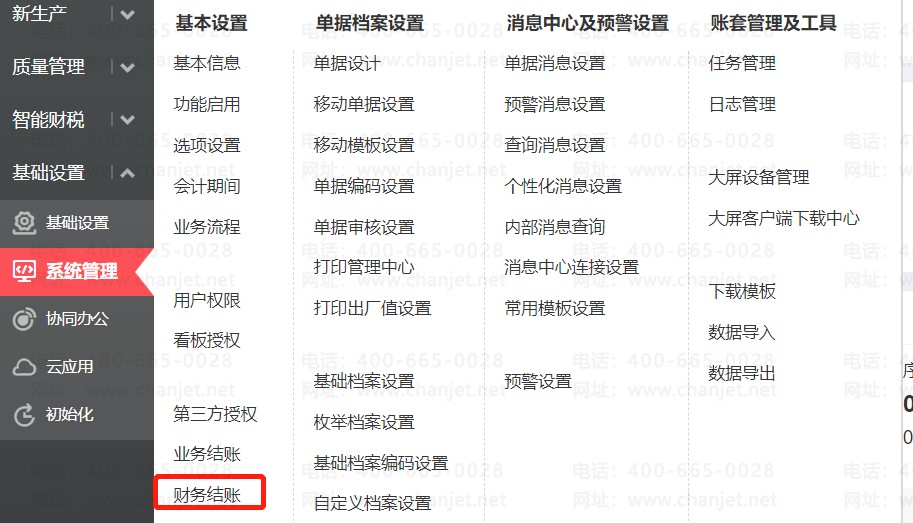 2.检查期初月份是否已经结账,点击【系统管理】-【财务结账】,期末结账需要为空白