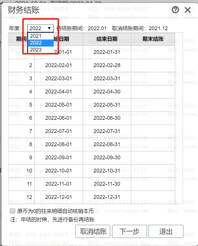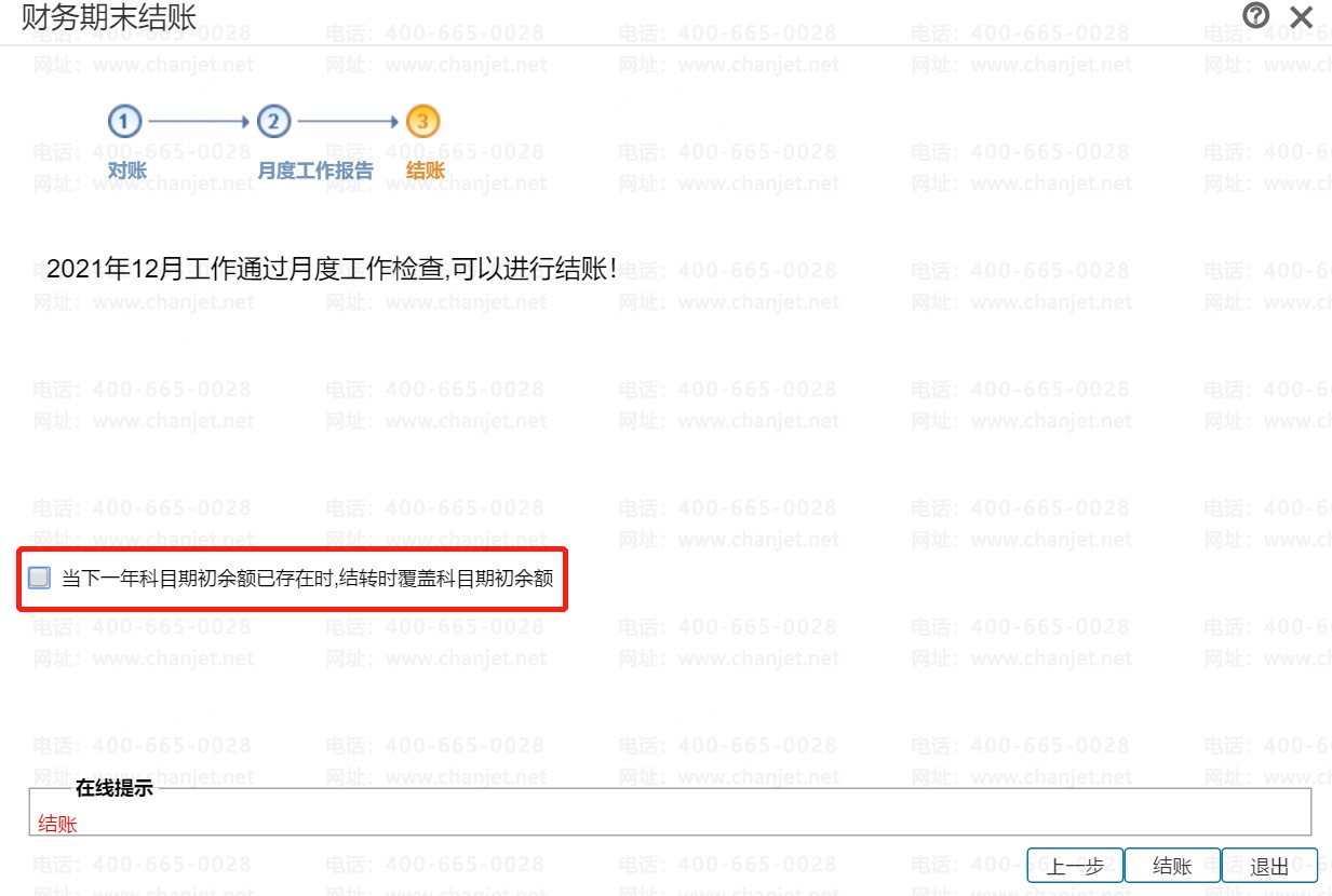 3.有多年度账,期初的数据是从上年度结转过来的,导致科目期初余额修改不了,取消上年度最后一个月的结账后,重新结账时不勾选“当下一年科目期初余额已存在时,结转时覆盖科目期初余额”即可