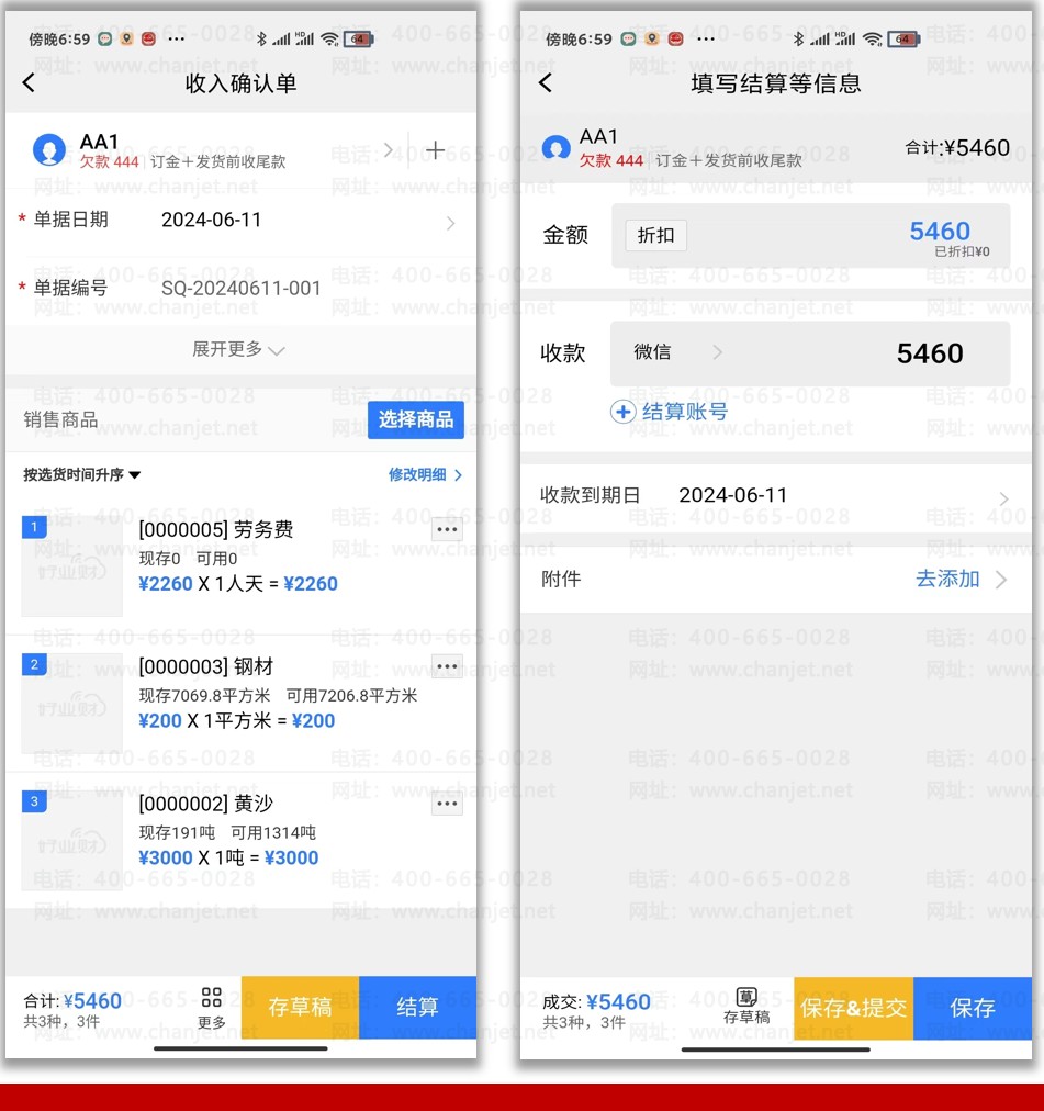 支持在手机上新增收入确认单、支出确认单