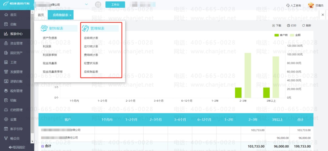 包括应收统计表、应付统计表、费用统计表、经营状况表和应收账龄表。这些报表支持按时间和金额进行排序,便于收付款管理。